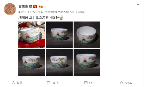 瓷杯的照片,配上“珐琅彩山水佩奇游春马蹄杯”的字样和一个奥特曼表情,新浪微博知名历史博主@文物医院 的这条微博立刻引来了无数关注。热门动漫形象和中国传统艺术打破次元壁的组合,立即引发了话题。