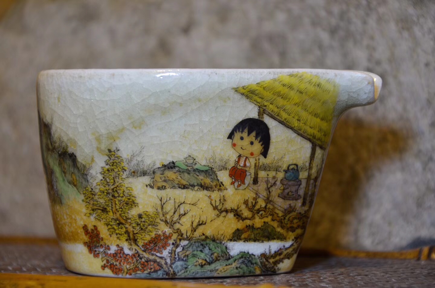 而这位年轻艺术家的灵感,常常来源于让动漫角色穿越到中国古典山水的脑洞。或许是因为他早年间在日本京都游学的经历,不少日本动漫角色被他画上了瓷杯,和山水画相映成趣。有坐在茅草亭下烹茶的樱桃小丸子、躺着读书的蜡笔小新、坐在大树上的龙猫……