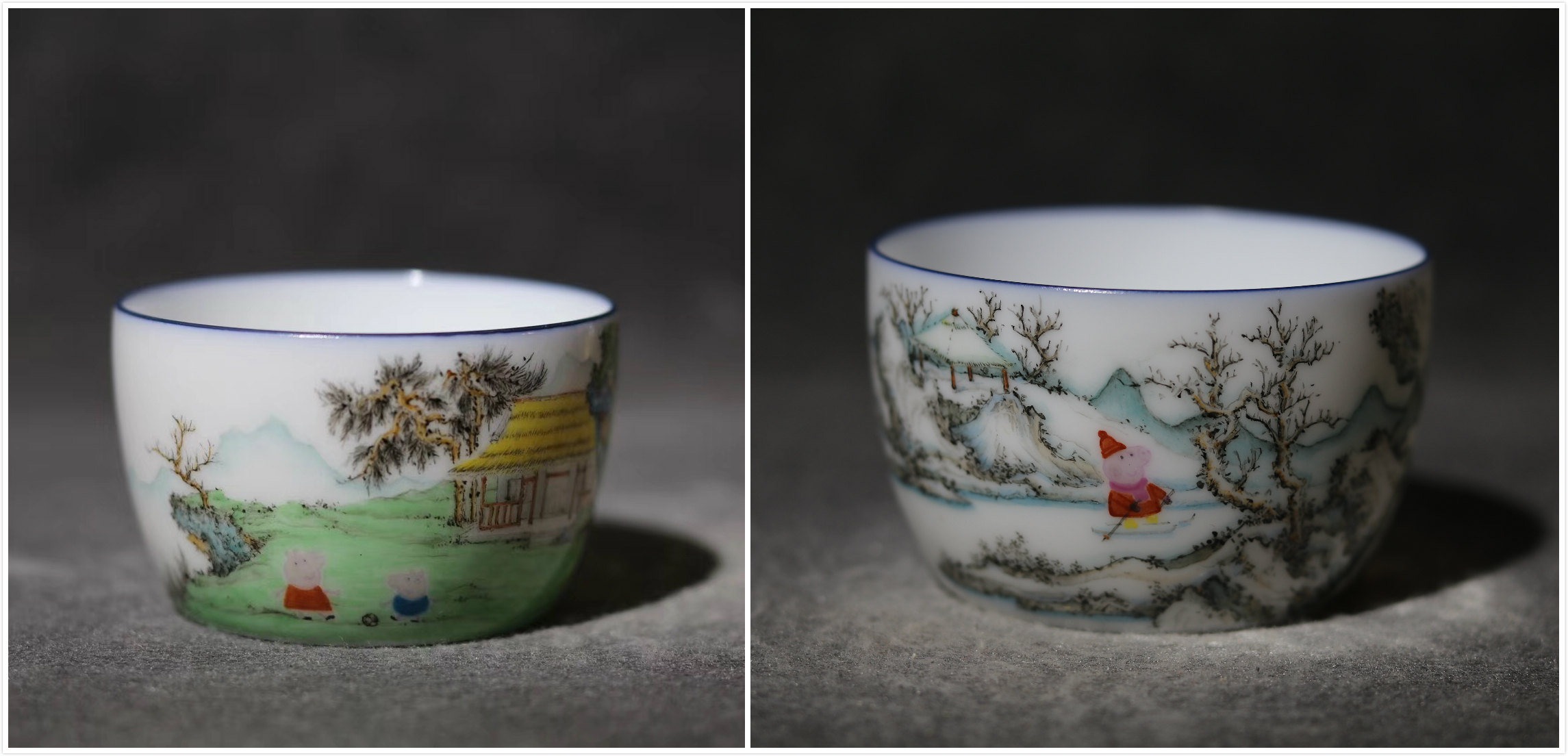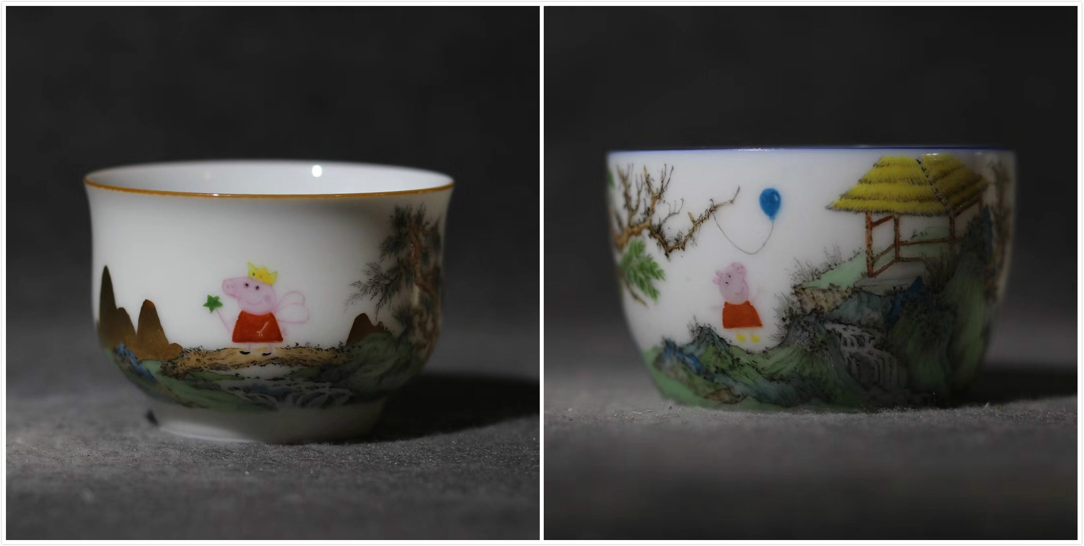 一只普通形制的瓷杯,上面绘制的传统的青绿山水,还有一只骑着自行车、一脸微笑的小猪佩奇。