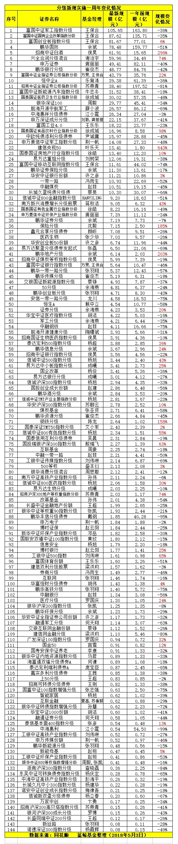 截至2018年5月3日,目前市场上共留存的分级基金有144只,与一年前相比,有32只分级基金规模有所上升,112只规模下滑,也就是说有近8成的分级基金规模都在下滑。