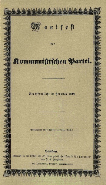 实际上,马克思已经接近完成。1月底,他把这份23页的文件寄到了伦敦。裁缝列斯纳把手稿送到了德国印刷商J.E.布格哈德手中,后者在伦敦利物浦街拥有一家店铺。这本小册子的标题叫做《共产党宣言》(虽然当时并不存在这样一个党),布格哈德给它搭配了一张暗绿色封皮。1848年2月底,印刷完成800份,作者的名字没有出现。英国宪章运动者乔治·朱利安·哈尼读到这本由马克思在布鲁塞尔郊区的小房子里创作、再由他夫人誊写的小册子后,称之为有史以来最具革命性的文件。