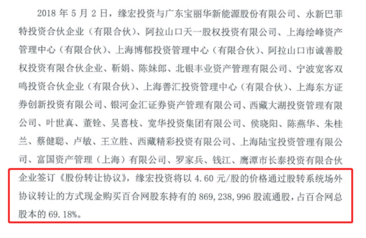 5月3日晚间,百合网发布公告称,宁波梅山保税港区缘宏投资有限公司(以下简称“缘宏投资”)拟以4.60元/股的价格,通过股转系统场外协议转让的方式,现金收购百合网部分股东持有的86923.9万股流通股。