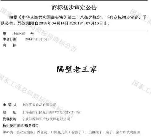 最近,一条关于“隔壁老王家”的商标初审公告尤为吸引小知的注意力。