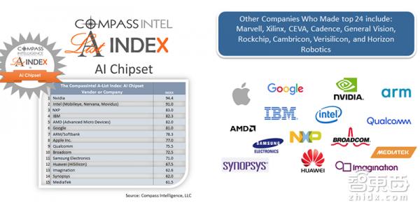 Compass Intelligence的报告称,AI Chipset Index的A-list包括提供AI芯片组的软件和硬件公司。AI芯片组包括中央处理器(CPU),图形处理器(GPU),神经网络处理器(NNP),专用集成电路(ASIC),现场可编程门阵列(FPGA),精简指令集计算机(RISC)处理器, 加速器等。有些芯片组针对边缘处理或设备,有些针对云计算中使用的服务器、以及一些针对机器视觉和自动驾驶平台等。