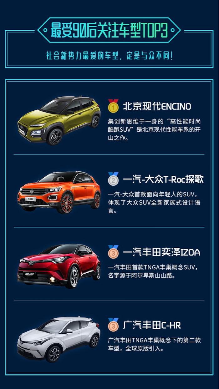 北京现代ENCINO、全新奔驰A级、一汽丰田奕泽IZOA、广汽丰田C-HR、Jeep全新一代牧马人、一汽大众T-Roc 探歌、领克02、吉利帝豪GS等车型出现在“最受90后关注车型”入围名单中。入围的车型均有着动感造型、高性能、个性鲜明。