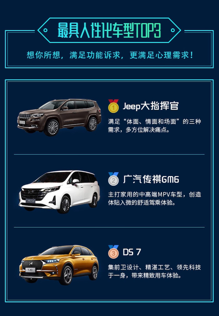 结果显示,位列最具人性化车型榜首的是Jeep大指挥官,它以61421票拔得头筹。这款专为中国消费者打造的车型,能满足高端中产家庭用车时对于全场合“体面、情面和场面”的三者需求。
