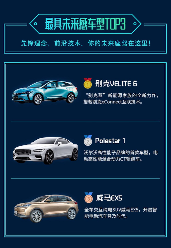 在“最具未来感的车型”入围名单中,吉利博瑞GE、全新雷克萨斯ES、别克VELITE 6、BMW i8 敞篷跑车、Polestar 1、威马EX5、捷豹 I-PACE、WEY P8等8款车型按照“突破”及“智能”等两项指标得到审视。