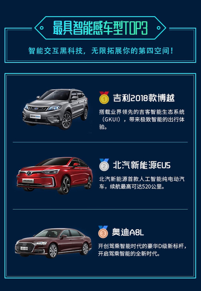 吉利2018款博越、北汽新能源EU5、上汽荣威RX8、长安福特福克斯、东风2018款启辰T90、奥迪A8L、BMW 5系插电混合动力、奇瑞瑞虎8等8款车型在“最具智能感车型”品类中展开角逐。