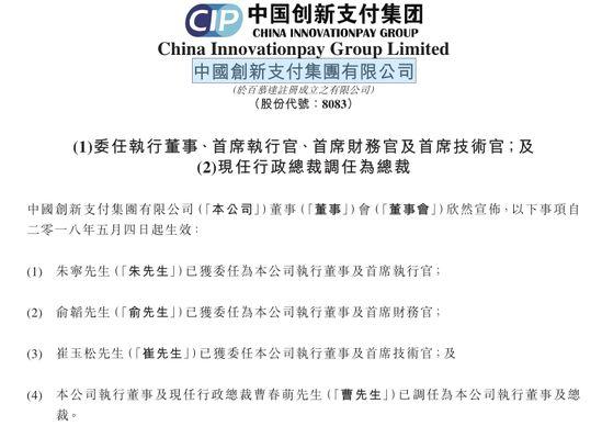 据亿邦动力网报道,5月4日,中国创新支付集团有限公司发布公告宣布人事变更,朱宁(白鸦)任公司执行董事和首席执行官。