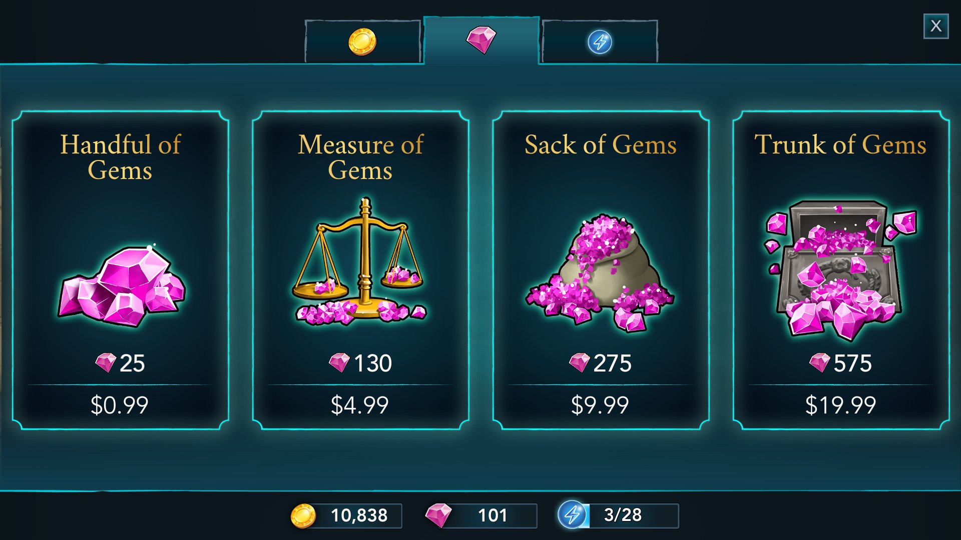 使用现金来购买宝石也被玩家诟病。一方面是宝石价格太贵,笔者手机上显示的价格为0.99美元换购25颗宝石,20颗宝石却只能够换取10点能量值。另一方面是,不同地区定价不同。据Eurogamer报道,一些玩家购买宝石的价格为4.99美元575颗宝石,一些玩家为9.99美元575颗宝石,但显然笔者的更贵(19.99美元575颗宝石)。即使在上周末,官方为玩家们发放了100颗宝石,意为感谢玩家们在游戏首发时的支持,但大部分玩家并没有因此改变自己的观点(我也没有)。