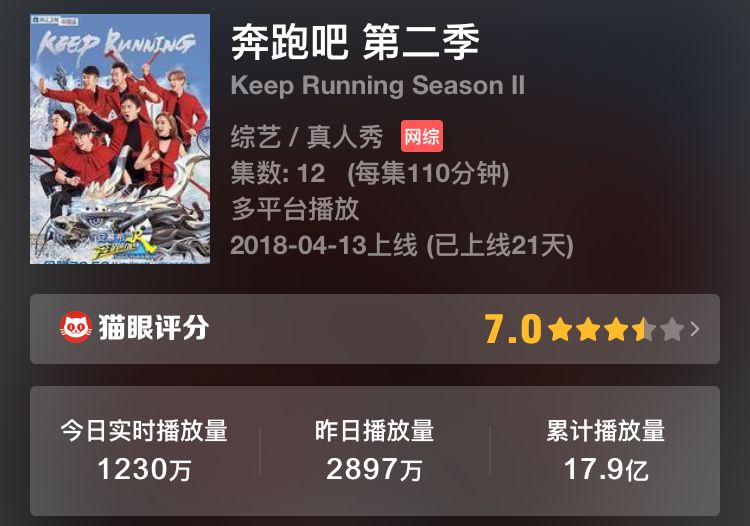 但这个风险度是可以通过合理前期策划来降低的。例如奔跑吧系列——替身、剪辑、炒流量cp等都引发了不少争议,但胜在前期整条故事线路的策划,虽然进行到现在的《奔跑吧》第二季口碑有所下滑,但播放数据依然强势。