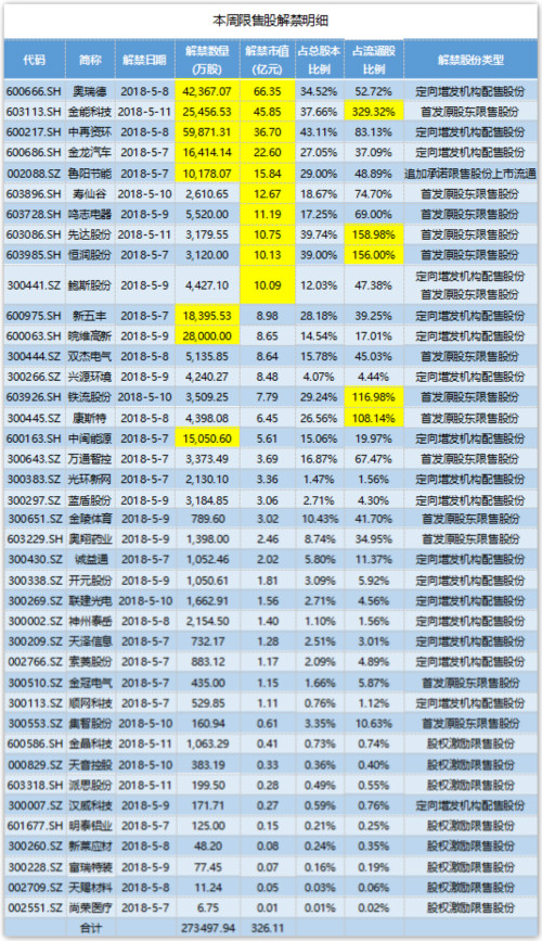 Wind数据显示,5月7日-5月11日共有40家公司限售股陆续解禁,合计解禁量27.35亿股,以5月4日收盘价计算,解禁市值为326.11亿元。