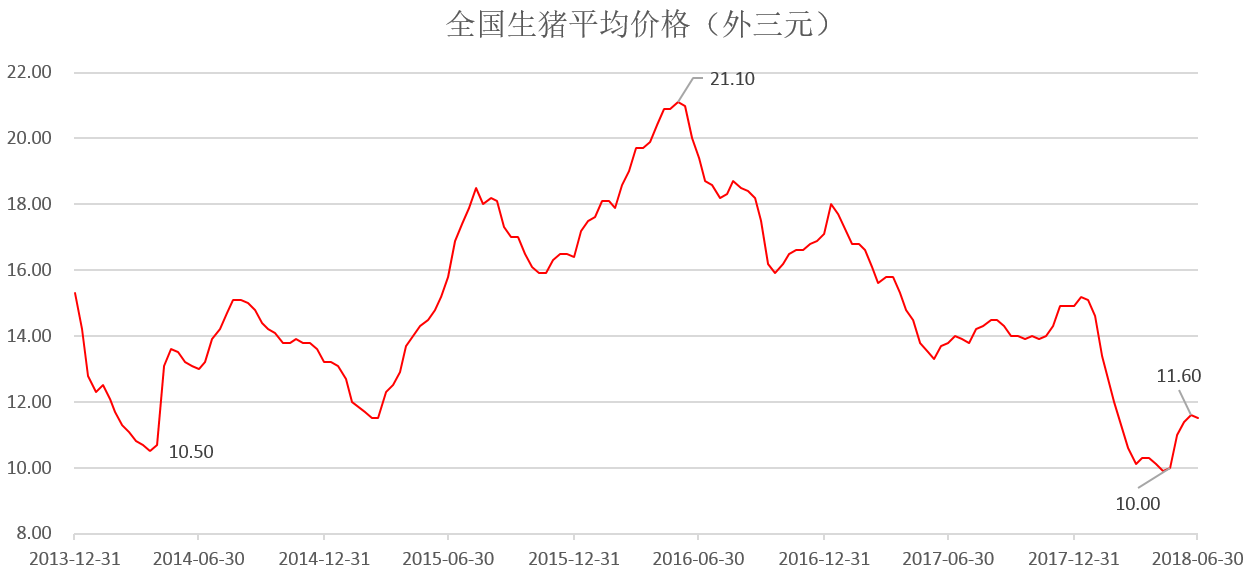 从历史走势上看,近5年间,全国生猪均价变化体现出明显的周期性特征,峰谷交替明显。对应到生产实践中表现为生猪价格出现连续上涨,接着母猪和生猪存栏量就会上涨,随后养殖户开始纷纷补栏、扩栏,造成新一轮的猪价下跌。在本轮上涨之前,猪价刚刚经历了一轮较大幅度的下挫,自1月10日至5月10日区间跌幅接近35%,目前虽然有较为明显的反弹迹象,但总体仍处于历史相对低位。