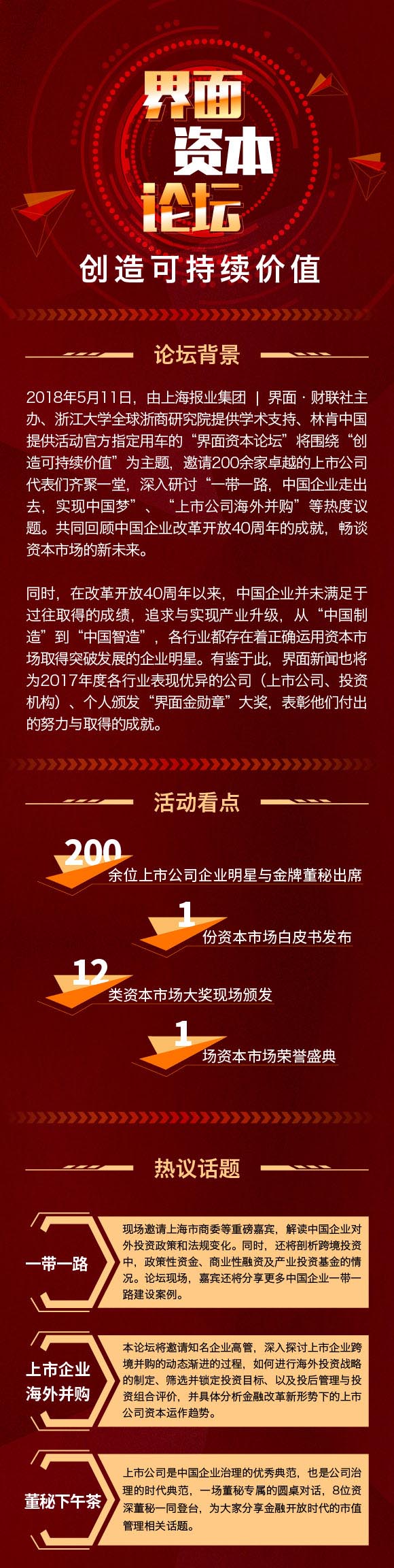 由上海报业集团 | 界面•财联社主办的2018年度界面资本论坛,即将在5月11日盛装启幕,本届论坛主题为“创造可持续价值”,由林肯中国提供官方指定用车,由浙江大学全球浙商研究院提供学术支持。现场明星云集,各路大咖将围绕资本市场可持续价值展开研讨。