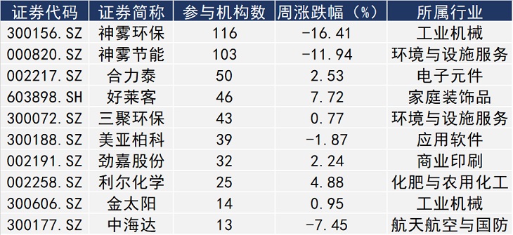行业分布信息显示,本周获调研的上市公司分别来自工业机械、电气部件与设备、环境与设施服务、调查和咨询服务、电子元件和重型电气设备等23个细分领域。这其中,隶属自工业机械、电气部件与设备行业的上市公司数量居前,均有4家。这两个行业的最热门调研上市公司分别为神雾环保(300156.SZ)、欣旺达(300207.SZ)。