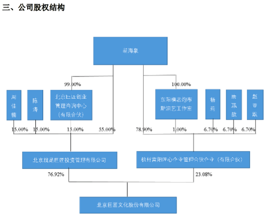 最明显的体现就是公司股东了,根据招股书显示,著名音乐人胡海泉通过几家公司间接持有巨匠文化72.17%的股权,是公司的第一大股东兼实际控制人。