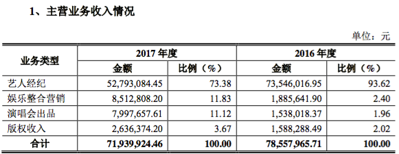 根据公转书资料,2016年、2017年巨匠文化营业收入分别为7855.8万元、7197.87万元;同期的净利润分别为444.07万元、378.47万元,从数据上看巨匠文化2017年不论是营业收入还是净利润都是亏损的,至于原因后文会详细分析,这里主要介绍经纪收入情况。
