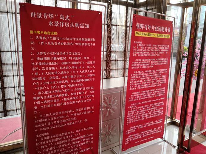 这个世景芳华楼盘位于丹东新城城区内,他们在5月3日开盘那天尚没有意识到来自朝鲜的消息对其他城市的人带来的震动。当大批外地投资客涌进这座边境城市后,他们当天赶制出这样的宣传广告。
