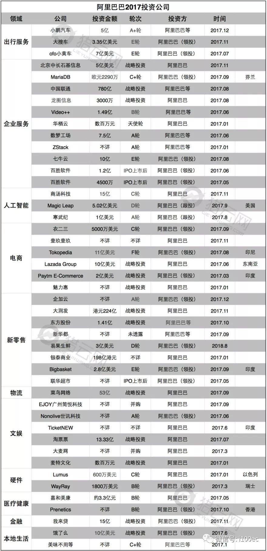 据电子商务研究中心不完全统计,2017年阿里巴巴投资的数量为45家,而在2016年,阿里巴巴为37家,增加了8家。其中包括: