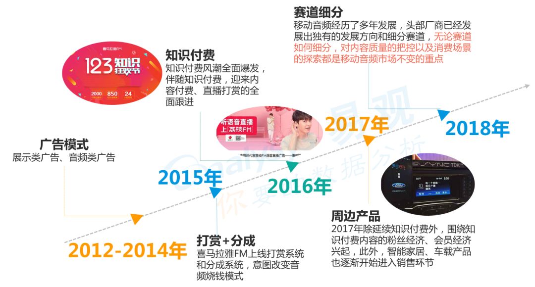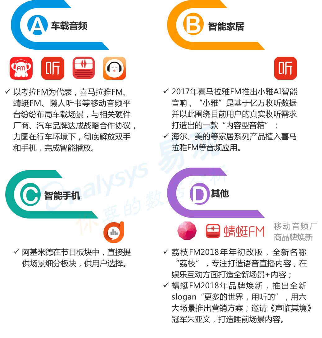 各大移动音频厂商在2017年制定了未来的发展战略,2018年是执行全新战略的一年,无论是喜马拉雅FM的知识付费+有声书产业链的综合大平台发展模式,懒人听书的细品类全发展模式,还是蜻蜓FM的内容付费+有声书产业链+会员模式,亦或是荔枝的强互动模式,各家在细分赛道中均有较大的成长空间;各大头部厂商凭借优质内容,对场景及生态的全面布局,衍生IP的打造上,将与更多的用户和跨行业厂商产生互动,形成全新的商业营收模式。