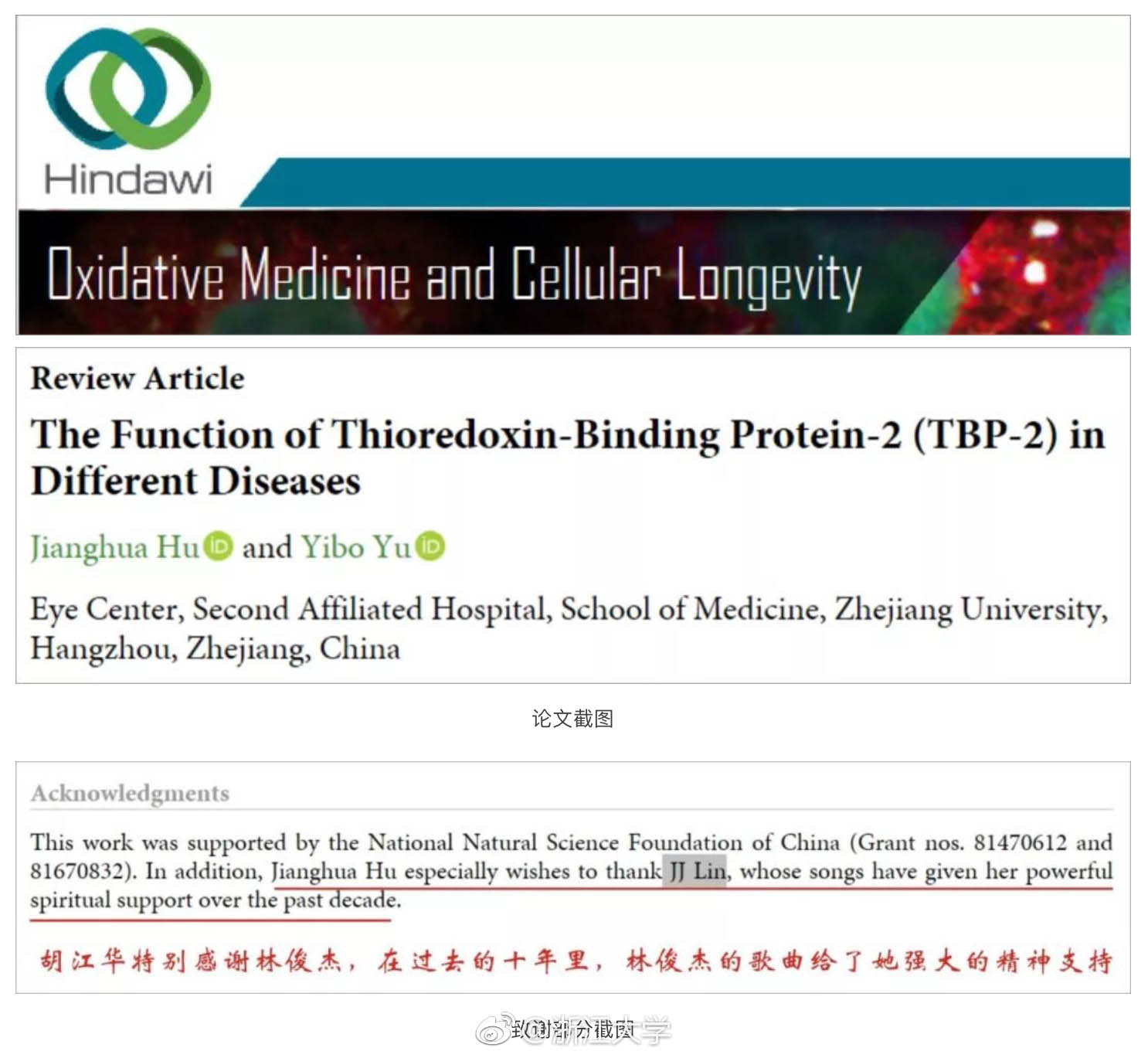 对爱豆的爱,用学术来表达:浙江大学医学院的一位同学在 Oxidative Medicine and Cellular Longevity 杂志发表了一篇SCI论文,致谢部分中出现了一个熟悉的名字:林俊杰。