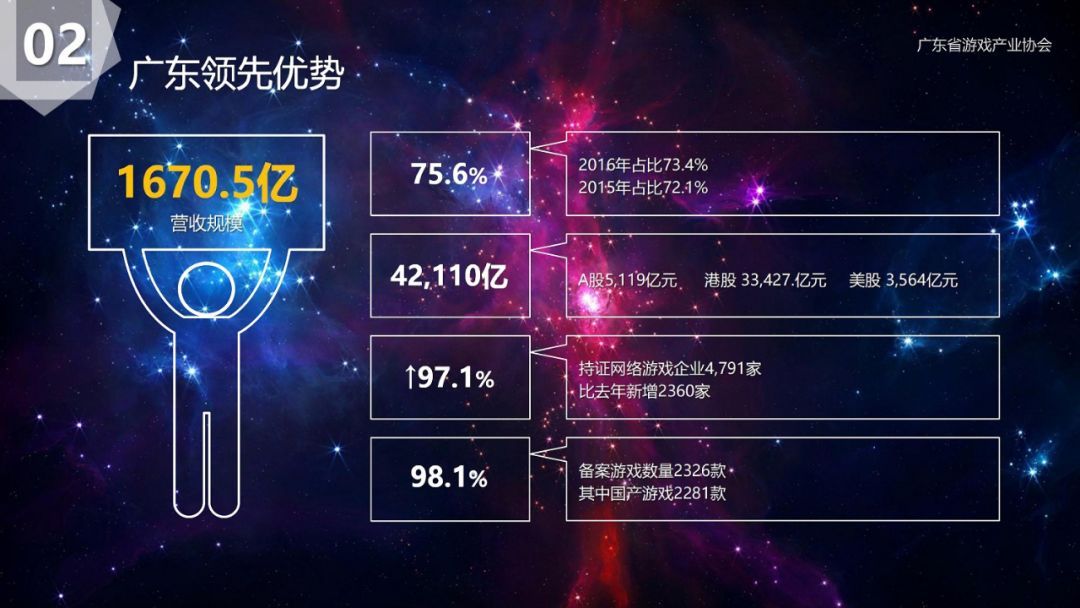 先说说广深游戏圈的发展情况,年初的时候广东省游戏产业协会发布了一份报告《2017广东游戏产业年度发展报告》。根据报告里面的数据显示,2017年广东游戏产业总产值达1670.5亿元,占全国约75.6%份额。