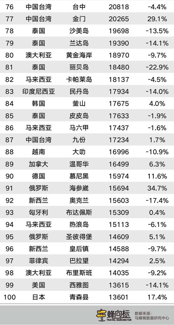 境外目的地中,热度涨幅前十的分别为宿雾、维也纳、海参崴、薄荷岛、金门、阿姆斯特丹、弗洛伦萨、青森县、杜马盖地和花莲。