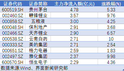 剔除尚未开板的新股,今日主力净流入额超1亿元的个股大幅增加至32只。酿酒板块强势领涨,贵州茅台(600519.SH)、五粮液(000858.SZ)获主力资金青睐,分别净流入4.78亿元、3.00亿元,其中,贵州茅台盘中股价一度站上700元大关,小幅回落后仍收涨5.33%,报698.17元/股。赣锋锂业(002460.SZ)、天齐锂业(002466.SZ)、雅化集团(002497.SZ)等锂电池概念股获抢筹,其主力净流入额分别为3.57亿元、2.90亿元、2.37亿元。其中赣锋锂业涨停。此外,美的集团(000333.SZ)、格力电器(000651.SZ)分别净流入2.71亿元、2.59亿元。