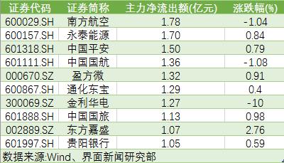 今日仅10只个股主力资金净流出额超1亿元。其中,南方航空(600029.SH)、中国国航(601111.SH)两只航空股遭主力大幅抛售,分别净流出1.78亿元、1.36亿元。中国平安(601318.SH)遭主力资金净流出1.50亿元。金利华电(300069.SZ)连续四日跌停,今日遭主力抛售1.27亿元。