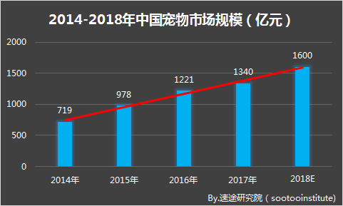 根据2014-2018年中国宠物市场规模走势图可以看出,市场整体呈稳定上升趋势,从2014年的719亿元,到2017年市场规模达已经到了1340亿元,中国宠物行业携着巨大的潜力快速发展,预计到2018年其市场规模可以达到1600亿元,而且在未来三年内,中国宠物市场规模有望突破2000亿元。