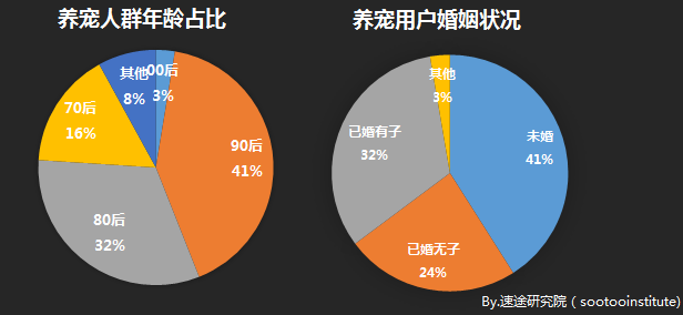 根据养宠用户画像可以看出,80后90后用户占比高达73%,而00后养宠物也逐渐成为趋势。养宠用户中未婚用户占比为41%,已婚用户占比超过50%,并且已婚有子的用户占比也达到32%,比已婚无子的用户占比略高。