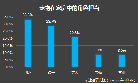 根据宠物在家庭中的角色担当调研结果可以看出,选择宠物担当亲密角色(朋友、孩子、亲人)的用户占比超过80%,只有不到20%的受访者认为宠物只是宠物或者其他角色。