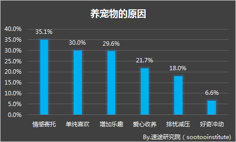 用户调研结果显示,可以寄托情感在宠物身上是养宠物最主要的原因,其次喜欢宠物也是一大因素,还有29.6%的养宠用户是看重宠物可以增加乐趣,因为好奇冲动养宠物的人群占比比较低,仅占6.6%。由此可以看出,人们养宠物主要是增加生活的乐趣、可以陪伴自己以及排忧解难,这跟社会主体人群目前的情感状况是比较相符的。