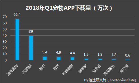 根据2018年Q1宠物APP的下载量可以看出,波奇宠物以66.4万的下载量占据第一,E宠商城以39万的下载量位居第二,有宠4.9万的下载量直逼位列第三名的握爪。