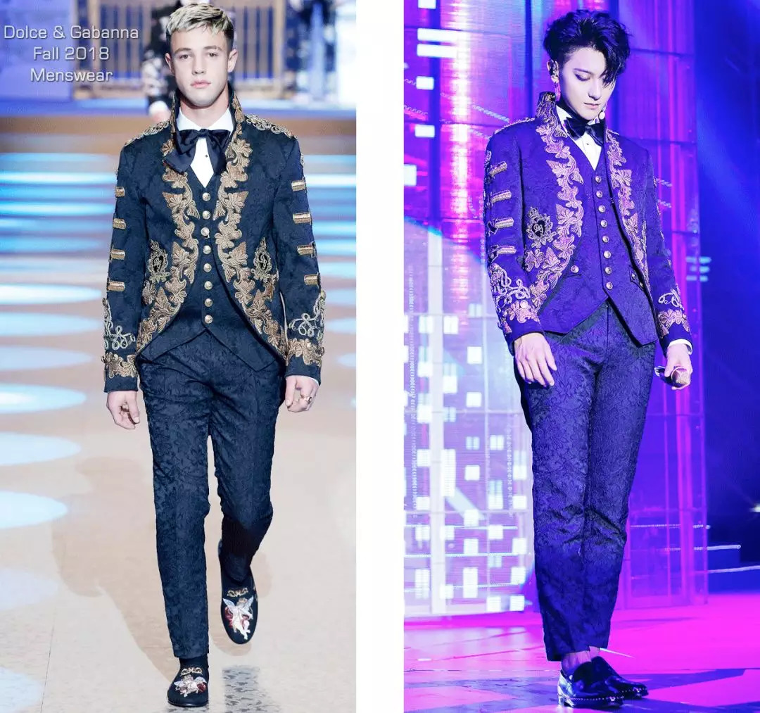 宫廷风金色刺绣西装和暗纹的刺绣长裤衬得他很贵气,和精致的眼线最搭,是一晚上喝八次血的暗夜贵公子,德古拉的外甥;