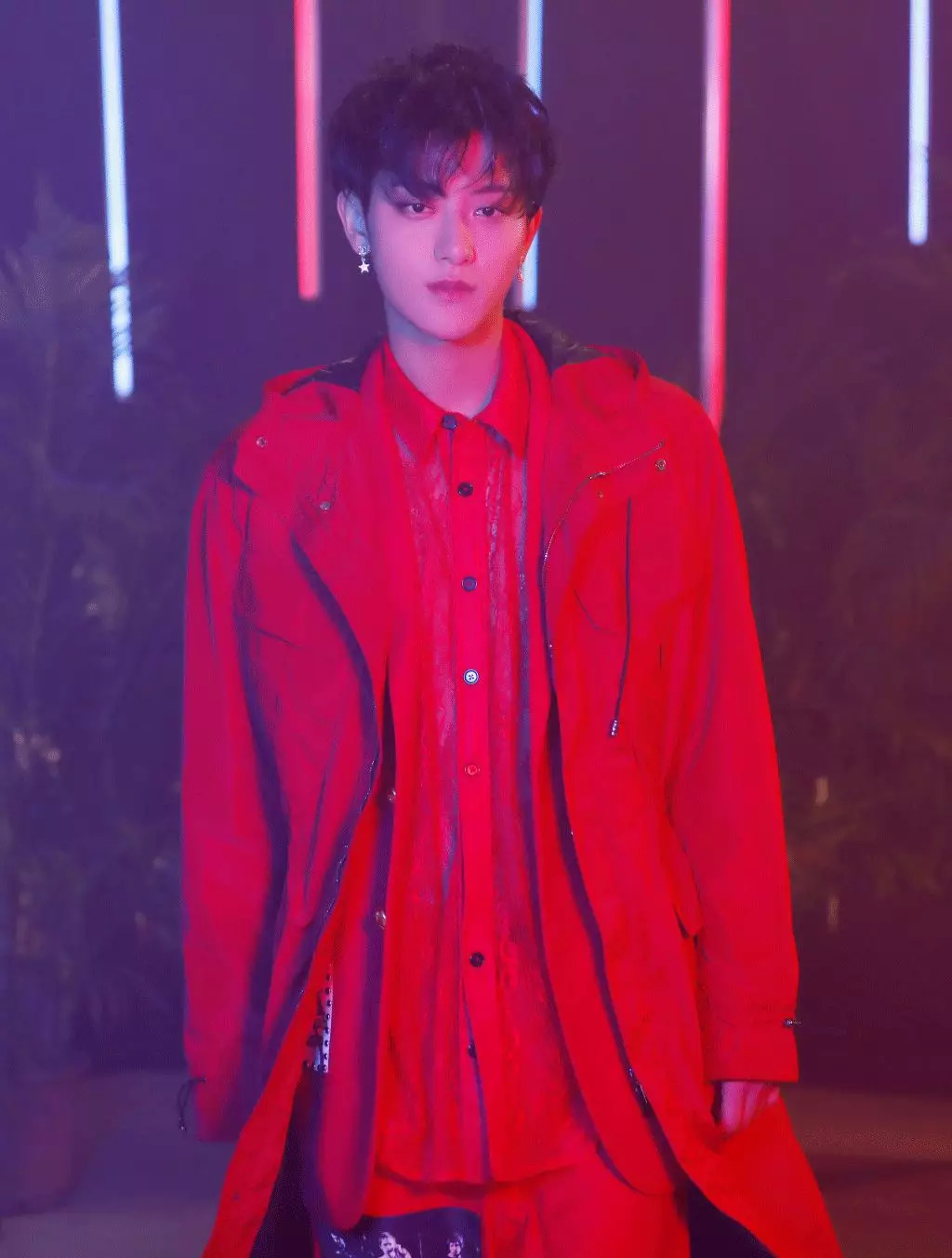 他敢穿一身血红色,还是红色蕾丝衬衫配红色冲锋衣。效果呢,竟然不错,有种玫瑰的感觉,浓烈、漂亮,又不好惹。