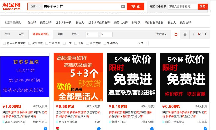 此外淘宝上的拼多多砍价群,销量也很高。
