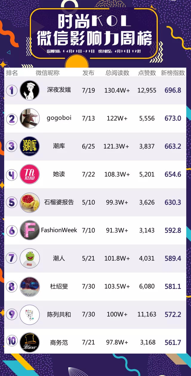 中服时尚本次发布【时尚KOL微信影响力排行榜】,让我们一起看看哪个KOL最有影响力!