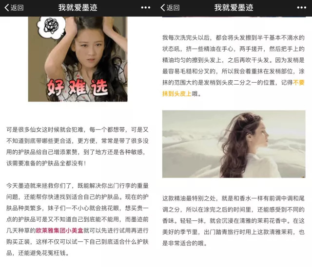 每篇文章都要直击女生心里的痛点,比如法令纹、美白、预防初老这样的肌肤问题。“墨迹”会给粉丝们推荐较爆款的护肤品,粉丝基础比较强大,每篇文章的留言和点赞颇多。