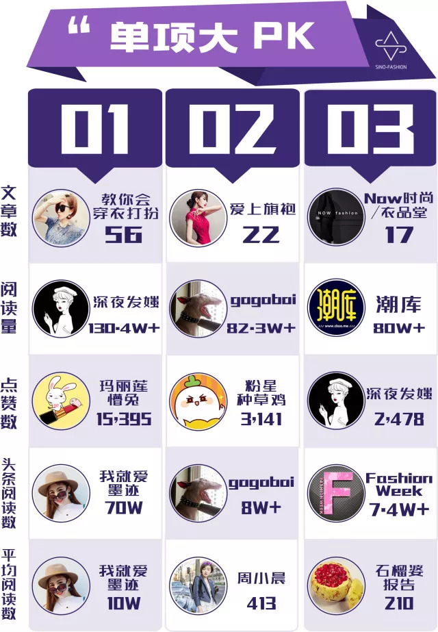 发布数量最多的是“教你穿衣打扮”,“爱上旗袍”稳居第二,Now时尚和衣品堂并列第三。总榜第一名的“深夜发媸”在阅读量上当仁不让坚守第一的宝座。“玛丽莲懵兔”被点赞最多,是第二、第三名的好几倍,可见深受粉丝喜爱。本期出现的新面孔是“我就爱墨迹”,包揽了头条阅读和平均阅读量最高两个席位。