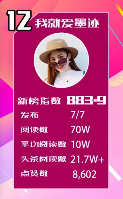 在前面的单项排行榜我们了解到,头条阅读和平均阅读量最高的是公众号我就爱墨迹。这个在总榜排名12的公众号一周发布了7篇文章,每篇都是10万+哦。