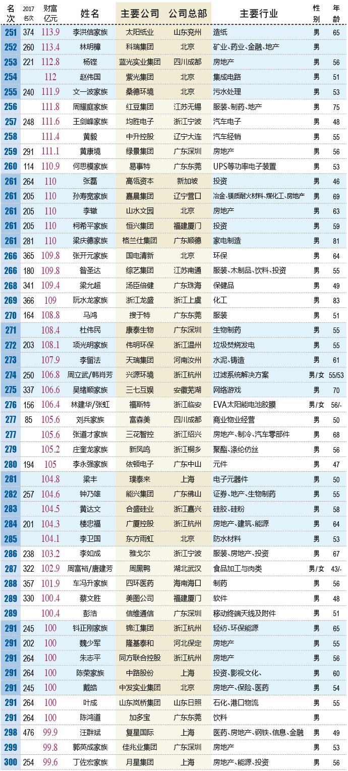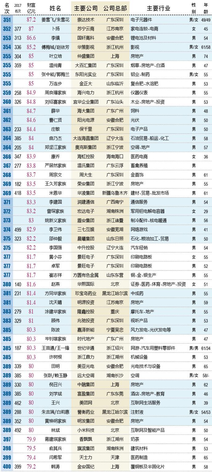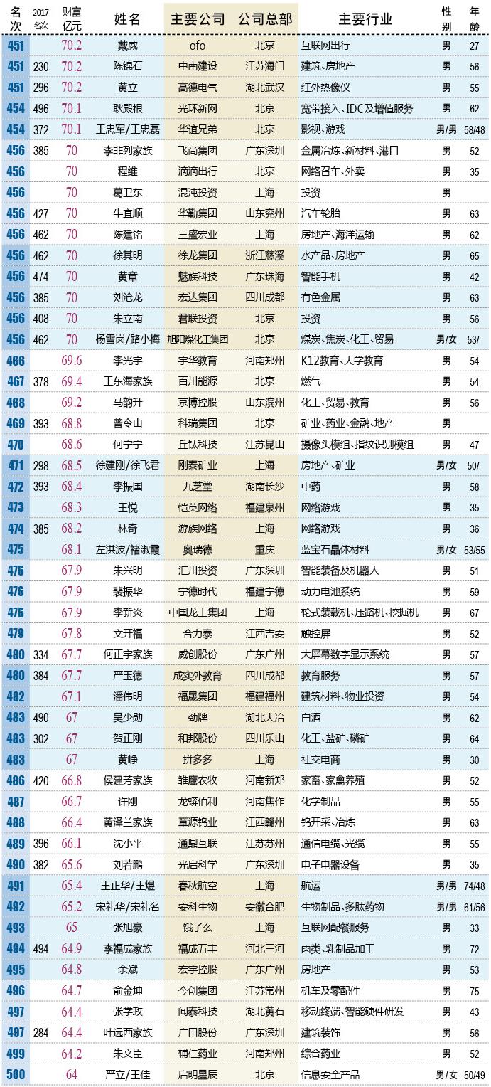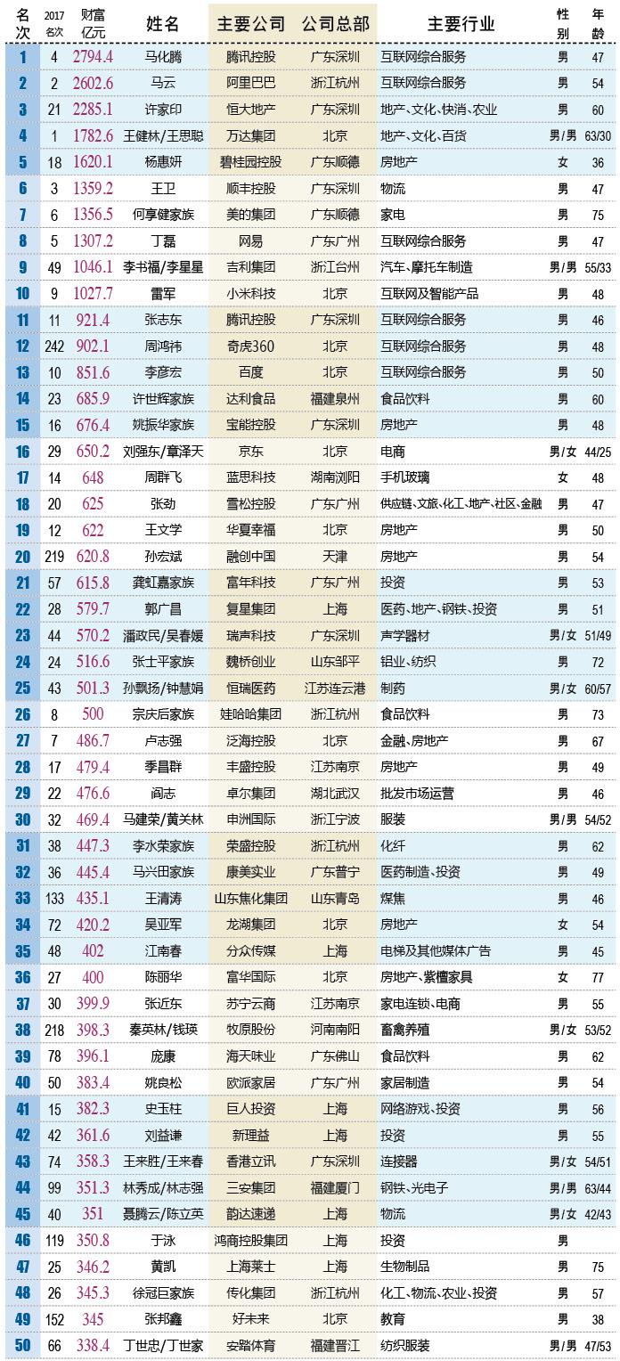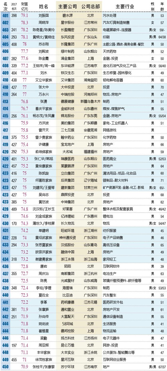 2017-2018财富最快成长50人榜单:2017-2018财富最快跌落50人榜单: