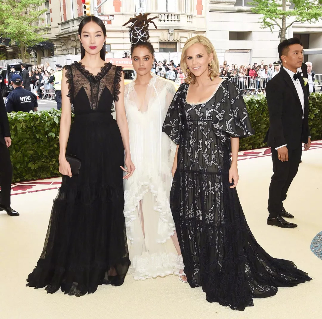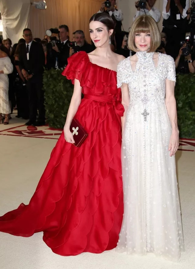 Anna Wintour携自己的女儿早早进入会场,可以说是给后面的巨星名流留足了闪光灯的时间。今天其一身Pierpaolo Piccioli设计的华伦天奴高级定制礼服,圣洁而典雅,而身旁女儿Bee Shaffer的宝石红香奈儿长裙款式复古而经典,既没有抢掉妈妈贴合主题的穿着风头,又极为大气和惹眼,母女二人搭配吸睛度真的是恰恰好。