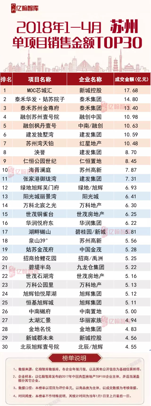 分析榜单来看,本月苏州项目TOP30的门槛值达到4.55亿,MOC芯城汇以17.68亿的成交金额高居榜首。整体来看,4月份榜单浮动较小,新入榜项目仅有8个。入榜项目集中分布在吴中、吴江以及相城三区,数量占比达到61%。