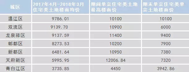 整理分析土地成交数据,排除价格明显过低的人才公寓用地,最近12个月(去年4月截至今年3月)从成都全域土地出让价格来看,成都最新的“11+2”中心城区范围内除青白江区外,最高地价(楼面地价)已全部破万。值得关注的是,天府新区是均价和单宗最高价差距最大的一个城区,而龙泉驿、温江、双流三区的平均楼面地价均长期维持在9000元/平米以上,逼近核心城区。