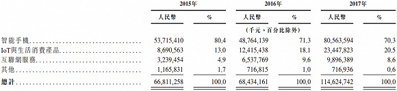 虽然“不期望硬件成为利润的主要来源”,并表示硬件综合净利率永不超5%,这部分既包括众所周知的智能手机同时还包括“IoT与生活消费产品”,其中包括智能家居设备、穿戴式设备、汽车市场网络、智能保健市场。但实际上在2015-2017年的三年时间里,智能手机分别贡献其总收入的80.4%、71.3%及70.3%,IoT与生活消费产品分别贡献13%、18.1%及20.5%。