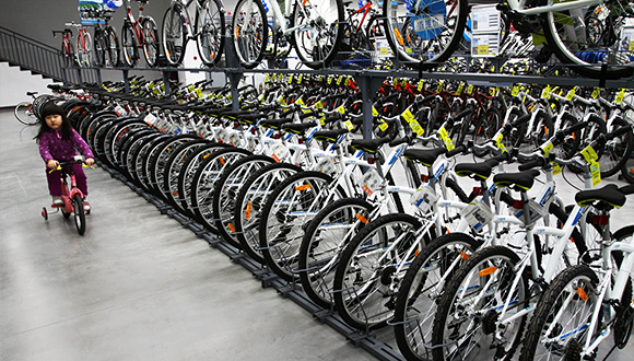 11月27日,星期四,下午两点,在浙江诸暨市城东新区,来自欧洲的专业体育用品运动超市迪卡侬店内,只有两三位顾客。