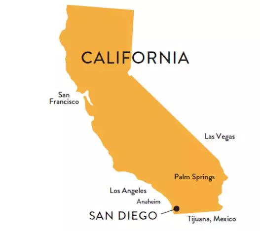 圣地亚哥位于美国加利福尼亚州南部,毗邻墨西哥,距离墨西哥蒂华纳仅半个小时车程。地理位置极佳,西边沿海,距离洛杉矶国际机场仅2.5小时车程,向东驾驶5.5小时,便到达“罪恶之城”拉斯维加斯。