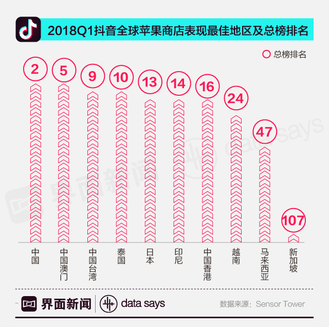 2018年第一季度,抖音在7个地区的苹果商店总排行榜上都挤进前二十。但界面新闻记者整理发现,抖音表现最好的十个地区中有4个地区在中国,剩下6个都是中国的邻居。抖音出海,更像是去邻居家“串门”。