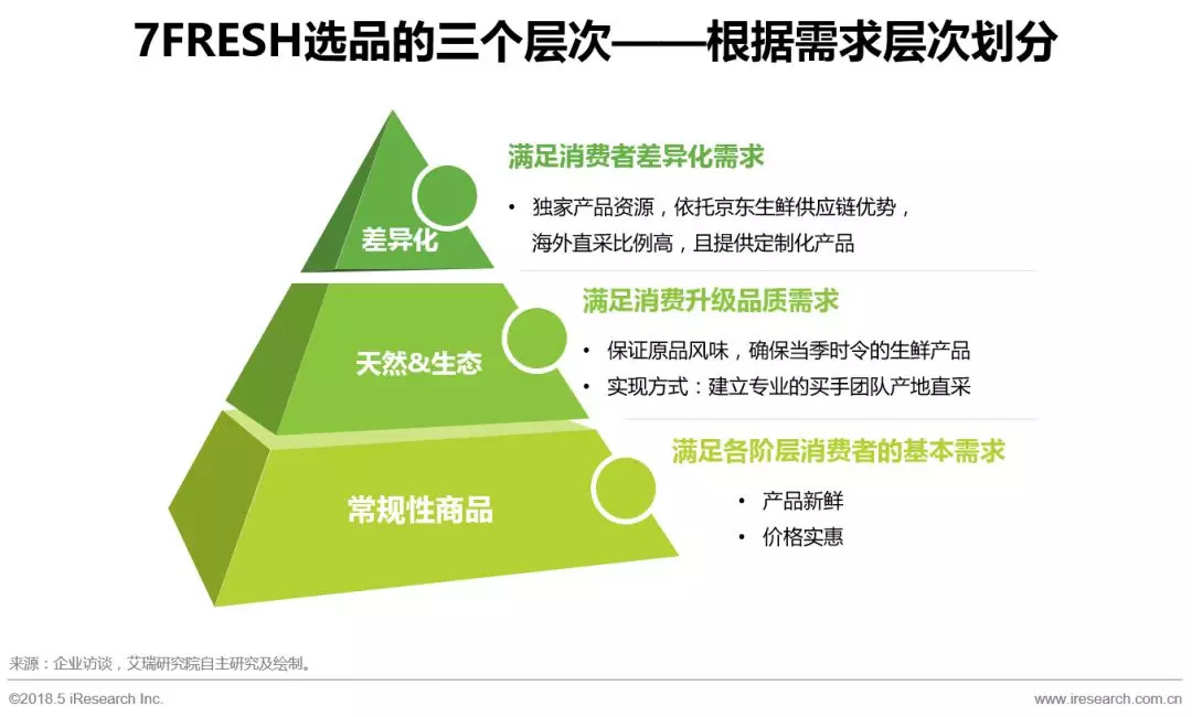 就需求定位而言,7FRESH将顾客需求分为三个层次并将其作为选品规划的依据。根据需求层次划分,7FRESH的选品分为常规性产品、天然&生态产品及差异化产品三个层次。其中,常规化需求对应于大众需求,满足个阶层消费者对于食品特别是生鲜类食品的基本需求;天然&生态产品满足高于基本需求的消费升级品质化需求,对于原品风味和应季时令提出更为严格地要求;差异化产品依托独家合作资源,满足消费者个性化需求。上述选品层次分别针对不同消费者对于生鲜产品的需求特征,但就基本要求而言,均在品控方面对生鲜供应链各环节提出更高的要求。